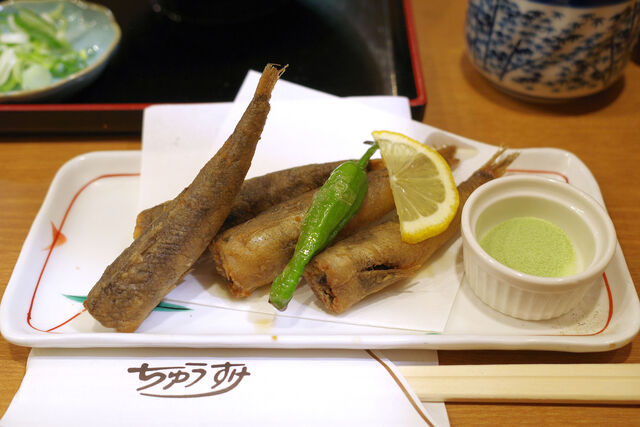 メヒカリの唐揚げ、3本のうち、2本はそのままいただき最後の1本はきしめんのお汁と一緒にいただく。