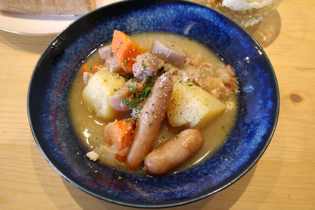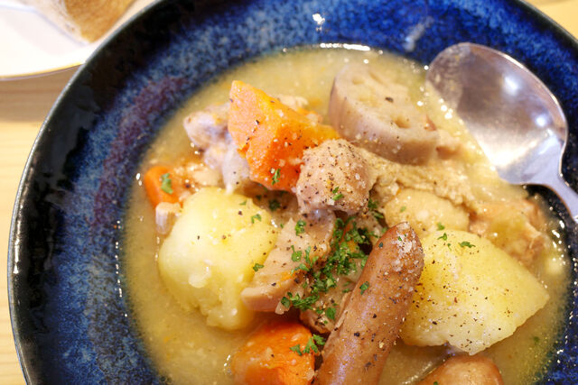 根菜にソーセージ、鶏肉。メニュー名の通りいろいろ具材がたっぷりのスープ