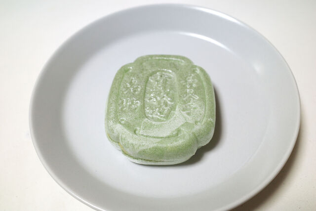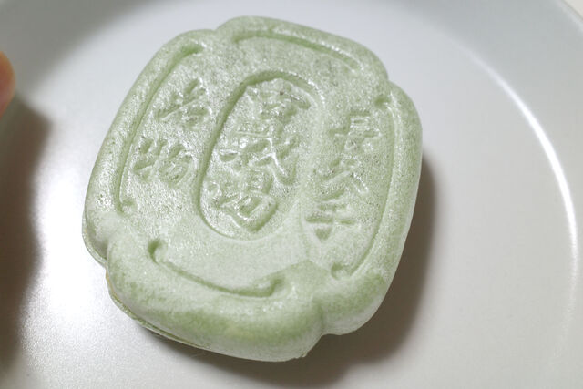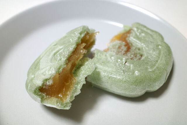 今回初めて知ったんだけど古戦場もなかには2種類のバリエーションがあって、一般的な黄褐色の最中皮のものと今回購入した薄緑色の最中皮のものがある。前者は小豆の粒餡、薄緑色の後者のほうにはゆず餡が入っているとのこと。