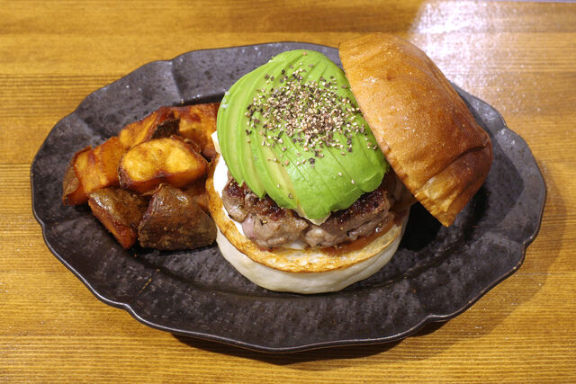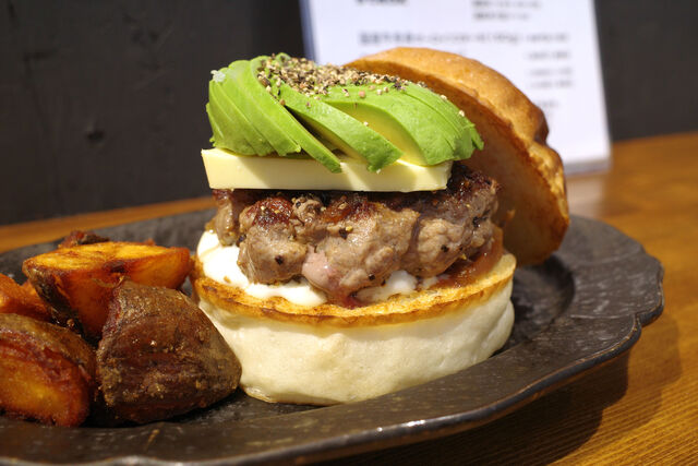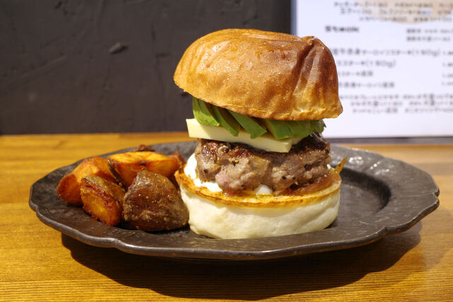見た目からして迫力のある手切りのビーフパティは噛みしめるほどに口の中に肉汁が広がる。牛肉本来の旨みに板バターのコク、オニオンソテーの甘み、そしてクリーミーなアボカド。