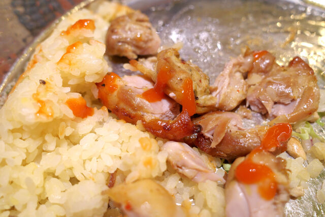 チリソースをかけて鶏もも焼きとおこわを混ぜ混ぜしていただきます。