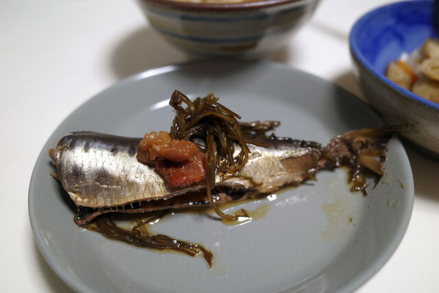 詳しいレシピはヨメさんに聞かないとわからないけどイワシを昆布と梅干しと一緒に圧力鍋で炊いたもの。骨まで柔らかで冷めてもウマいんだ。