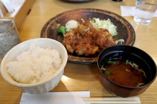 ランチのメニューはとんかつ、ハンバーグ、海老かつ、鶏の唐揚げの各定食。その中から自分がオーダーしたのは鶏の唐揚げ定食。