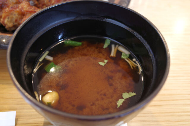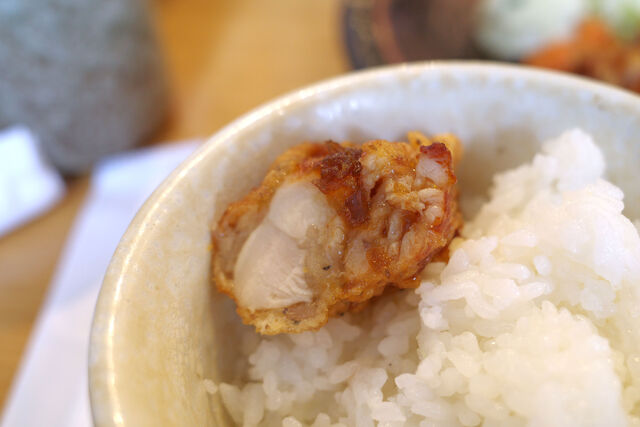 自家製の香味ソースがかかった鶏の唐揚げは衣サクサク、中身ジューシー。香味ソースの味がめっちゃ好みな感じ。ご飯が進む味。
