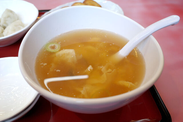 定食は餃子にライスとスープという構成。スープがたっぷりなのが嬉しいね。