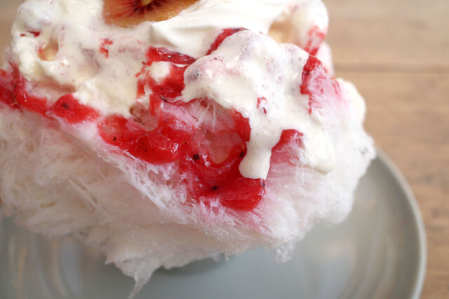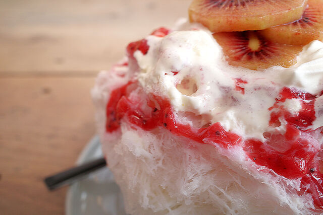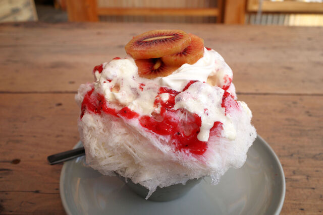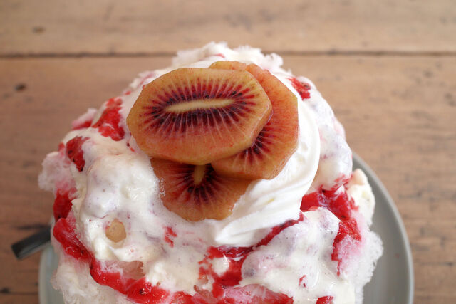 ここ数年流通してきたキウイの新品種の「ルビーレッドキウイ」をふんだんに使ったかき氷。