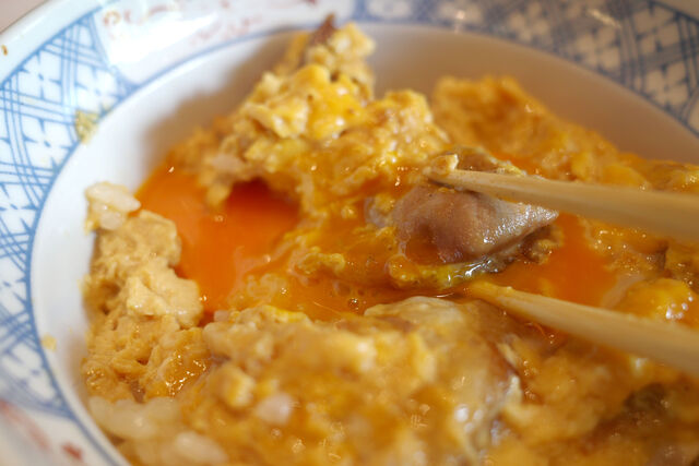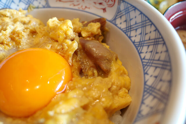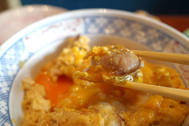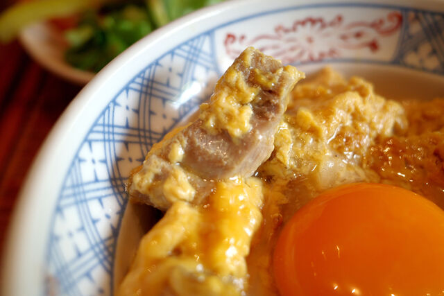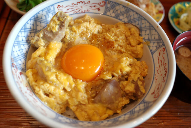 炭火で炙った名古屋コーチーンのもも肉を使った親子丼。中央には更に卵黄が乗っかってます。