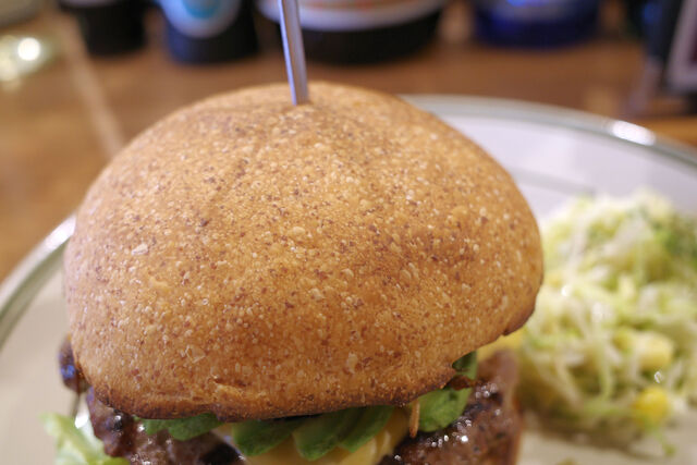 岐阜のベーカリー「ラスティコ」で特注された小麦胚芽入りのふんわり&さっくりバンズにマッシュルームオニオン、アボカド、チーズ、ビーフパティ、トマト、レタス
