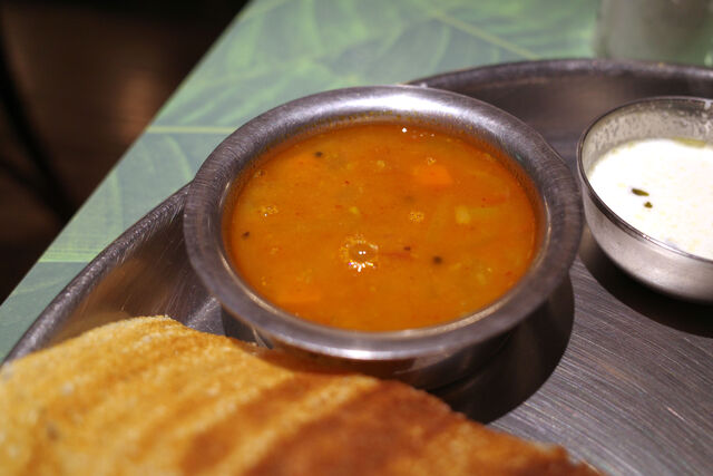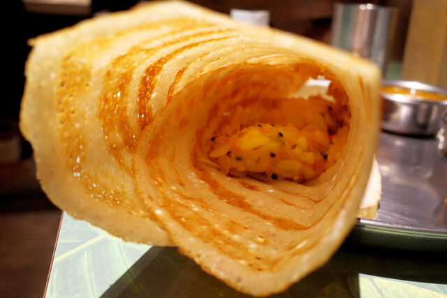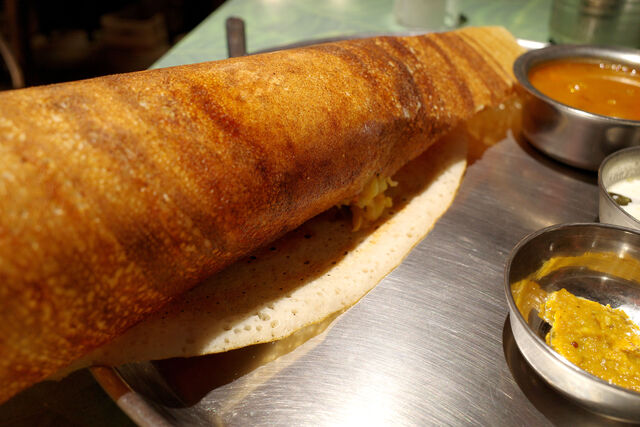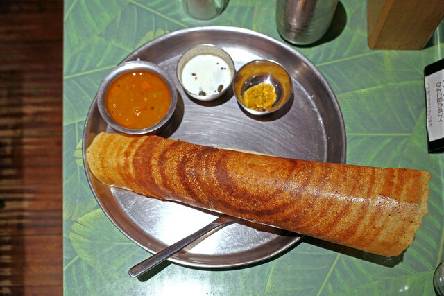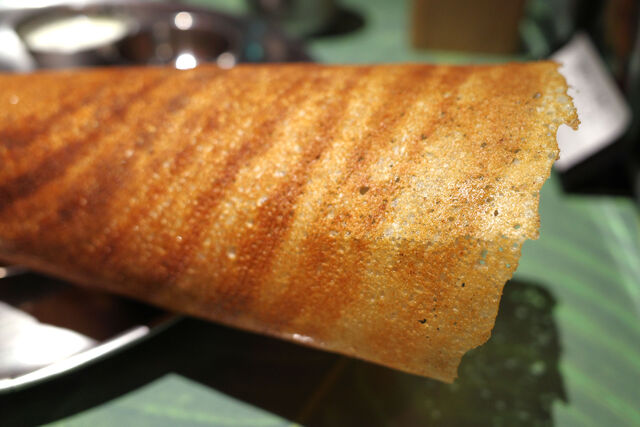 手でドーサをちぎりそのドーサでポテトマサラを包んだり、サンバルやチャトニにディップしたり・・・
