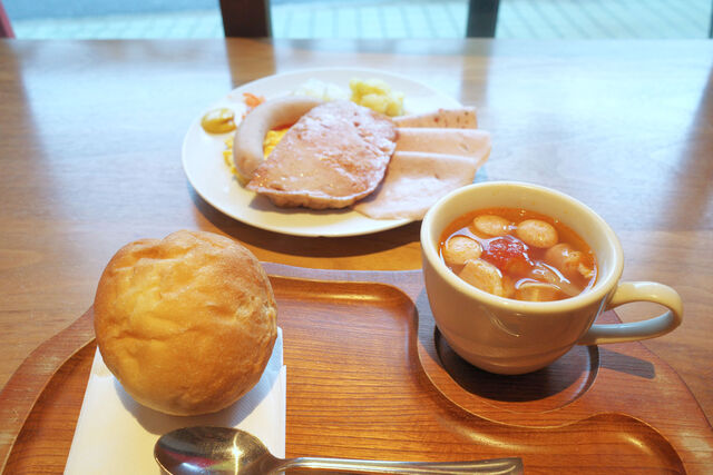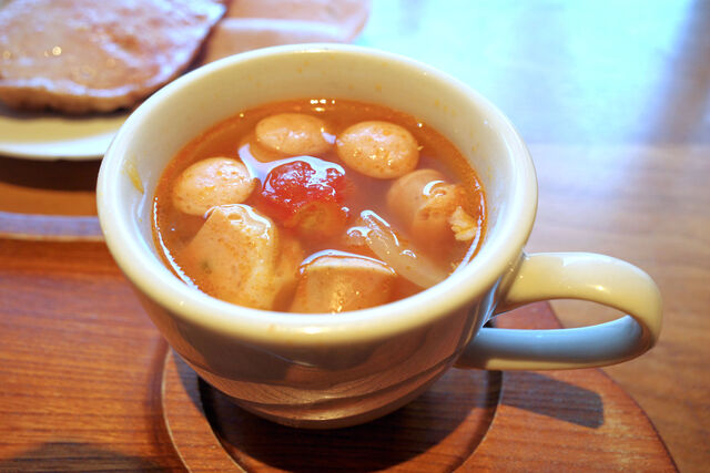 ドリンクは「ハム屋のトマトスープ」をチョイス。ハムやソーセージの切れ端がゴロゴロ入ってるんだ。