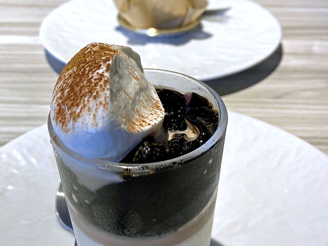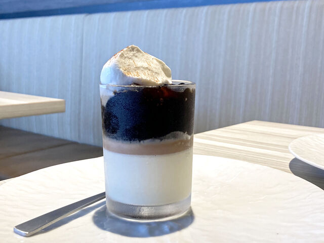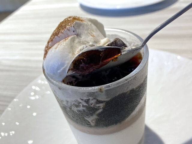 コーヒーゼリーの上の生クリームにはシナモンパウダー。