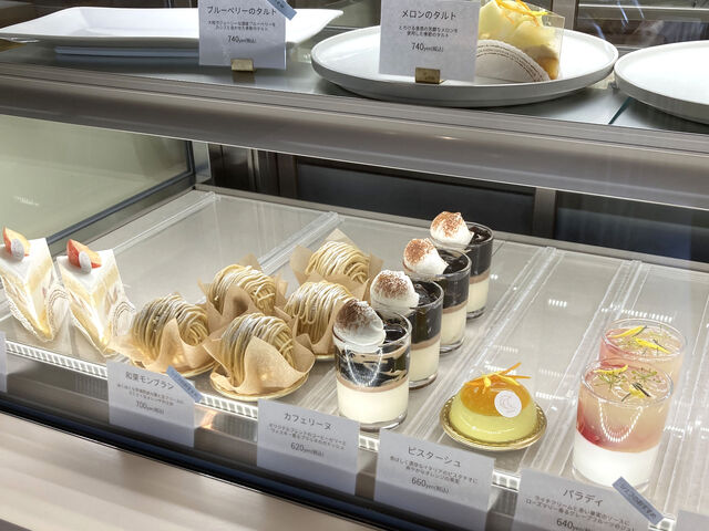 ヨメさんと自分、それぞれケーキとドリンクのセットをオーダー。ケーキはヨメさんが和栗モンブラン、自分はカフェリーヌというコーヒーゼリーベースのグラスケーキを。