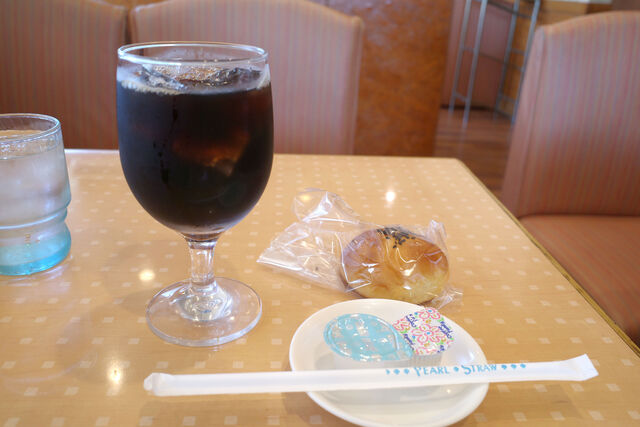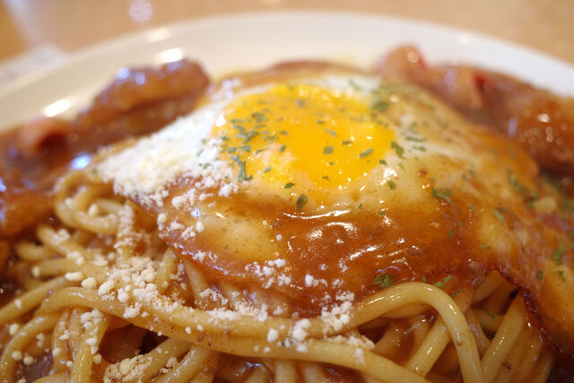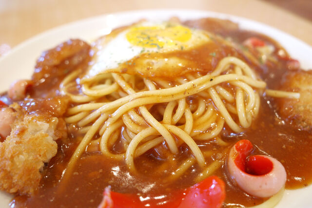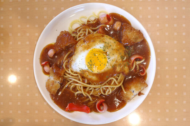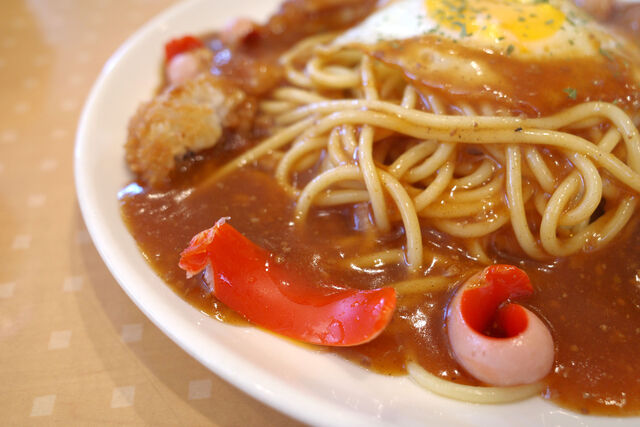 オーダーしたのはあんかけパスタのメニューからバイキングスパ(ウインナー、目玉焼き、魚フライ)とアイスコーヒー。