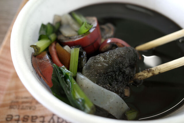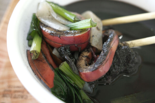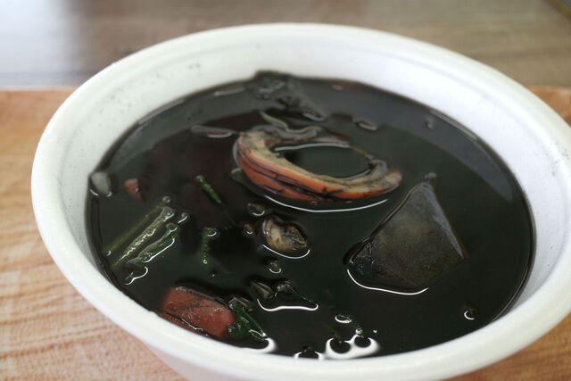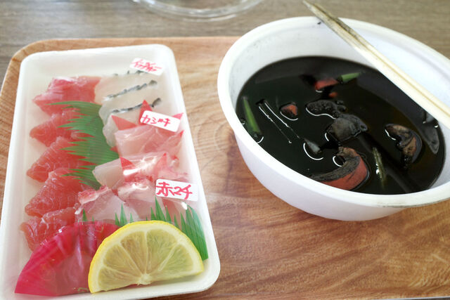 生まれて初めて食べたイカスミ汁、味はイカのダシの効いた味噌汁といった感じ。見た目とは裏腹にとっても美味しい。