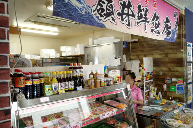 奥武島いまいゆ市場はひとつの通路沿いに海産物などを扱う店舗が複数店並んでいる小ぢんまりとした海鮮市場。