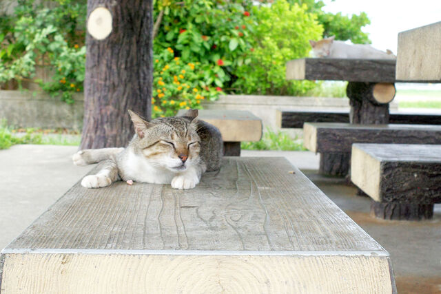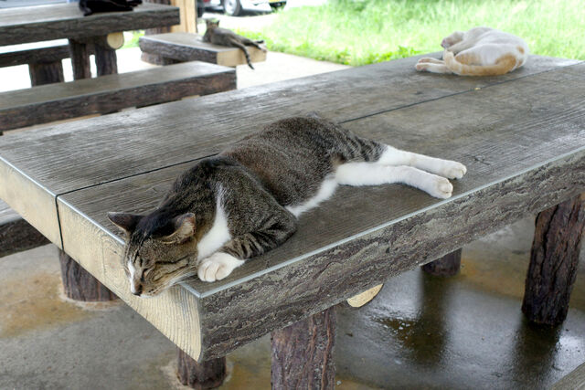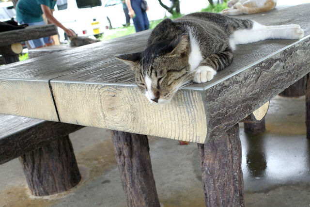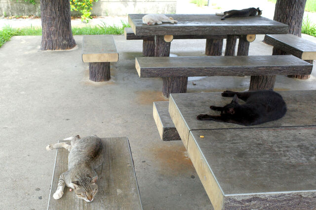 奥武島の漁港周辺ではいつも多くの猫さんを見かけるんだけど猛暑すぎるのかこの日はあまり見かけず・・・と思ったらみんな日陰を求め漁港近くの東屋に集合していました。笑