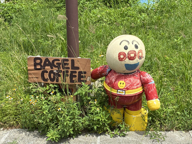 漁港の駐車場近くでいつも我々を出迎えてくれる使わなくなったブイで作ったと思われるアン◯ンマン。昨夏に来たときは全身が雑草に埋もれていて気づかなかったけどベーグル屋さんの案内看板だったのね。