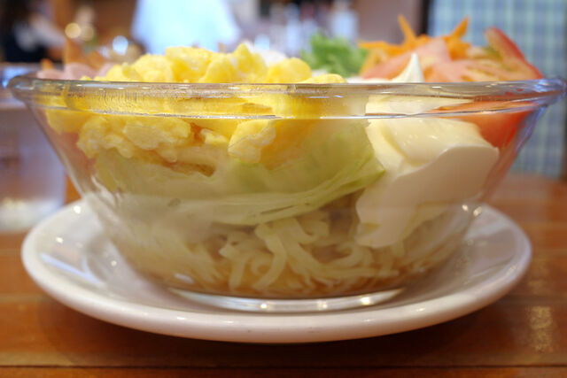 上に乗る具材がモリモリすぎてぱっと見、麺料理には思えないかも知れないけどガラスの器を横からみると、ちゃんと中華麺が入っています。↓
