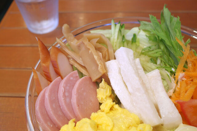 ボロニアソーセージにスモークチキン、メンマ、キュウリにセロリ。それらの具材の下にたっぷりレタス、中華麺。