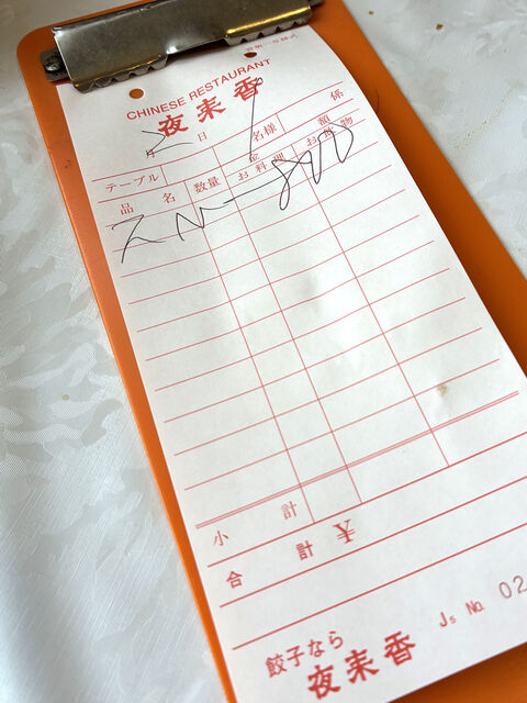 オーダーは店前の路上行燈看板にも掲示されているスペシャルランチ。相変わらず暗号文書のような伝票。笑