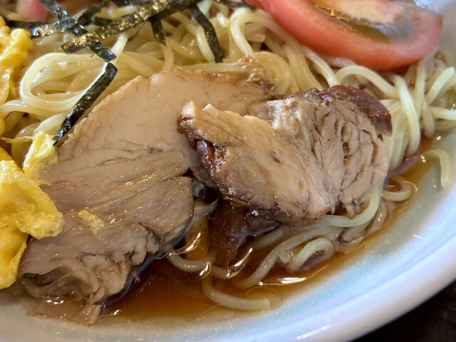中華麺にトマト、細切り、刻み海苔、かまぼこ、焼き立てスクランブルエッグ、そして絶品チャーシュー。このチャーシュー、ウマいんだよね。