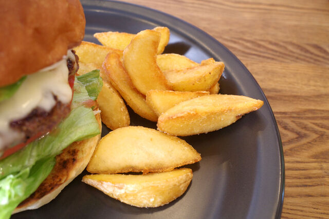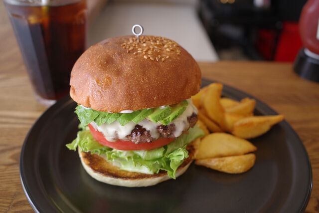 ふんわりバンズがパティから溢れ出た肉汁やらソースや野菜類から出る水分をしっかりと受け止めてくれるバランスの良いハンバーガー。手仕込みのビーフパティも絶品!