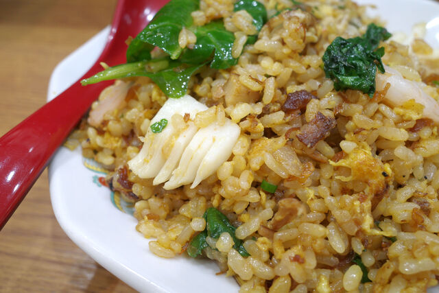 炒飯の中にはイカやエビなどの海鮮がごろんごろん。