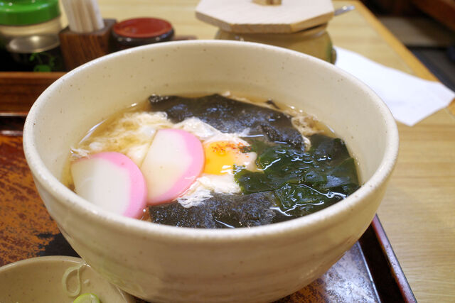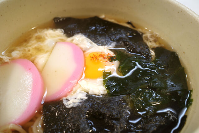 新角屋さんの松月の具材はかまぼこ、生卵、板海苔、わかめ。