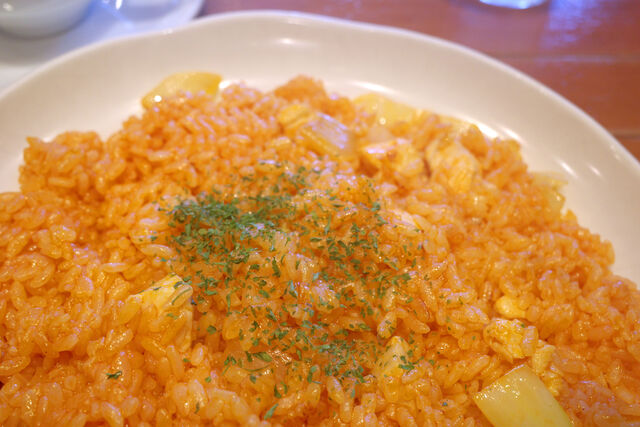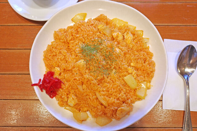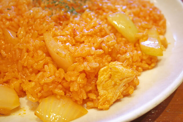たっぷりのバターで炒めたチキンライスには大きめなチキンと玉ねぎがごろんごろん。