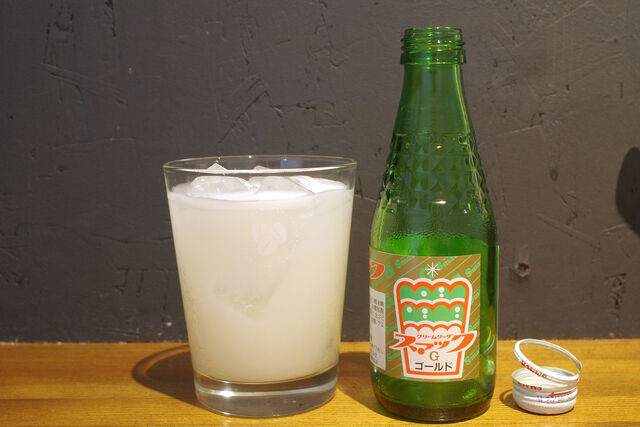 お供のドリンクには三重県桑名市発のローカル炭酸飲料、鈴木鉱泉のスマックゴールドを。